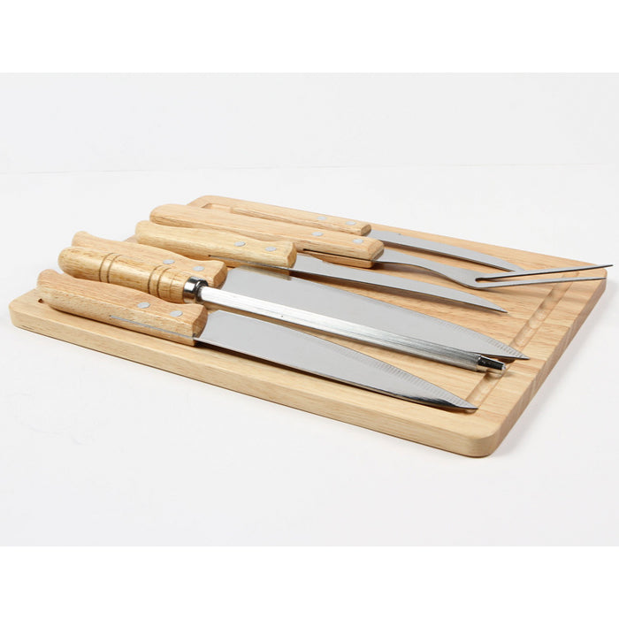 Set de BBQ fabricado en acero inoxidable y mangos de roble, incluye 7 piezas (cuchillo de chef, cuchillo pequeño, cuchillo deshuesador, cuchillo para carne, tenedor, afilador y tabla para cortar).