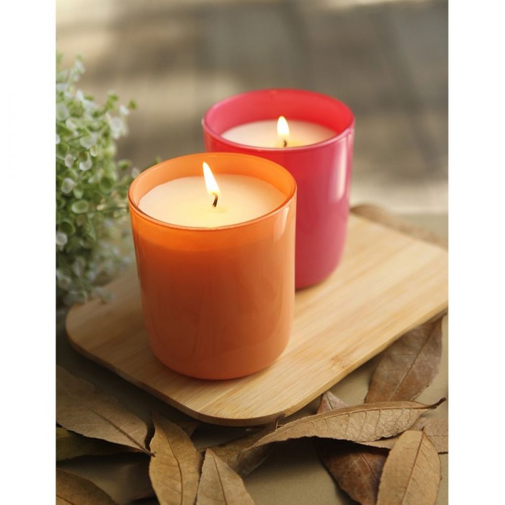 VELA SOAVE., VELA AROMÁTICA EN CONTENEDOR DE VIDRIO. CONCENTRACIÓN DEL 5 % DE ESENCIA. INCLUYE CAJA DE CARTÓN INDIVIDUAL., TIPO DE IMPRESIÓN:SERIGRAFIA 8X8, COLORES:BLANCO, NARANJA, ROSA, MEDIDAS:9X8 CM., MATERIALES DEL PRODUCTO:VIDRIO